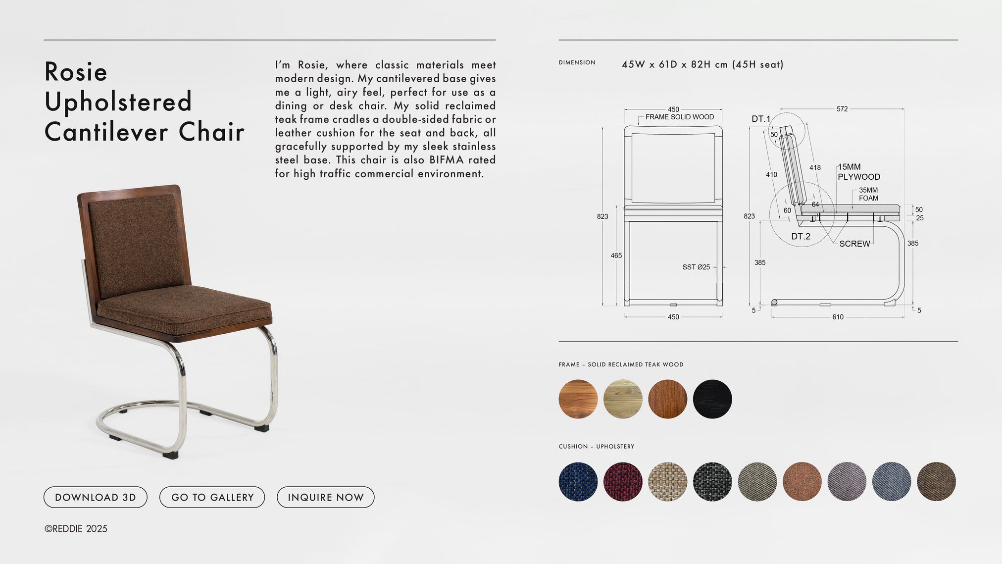 I’m Rosie, where classic materials meet modern design. My cantilevered base gives me a light, airy feel, perfect for use as a dining or desk chair. My solid reclaimed teak frame cradles a double-sided fabric or leather cushion for the seat and back, all gracefully supported by my sleek stainless steel base. This chair is also BIFMA rated for high traffic commercial environment.