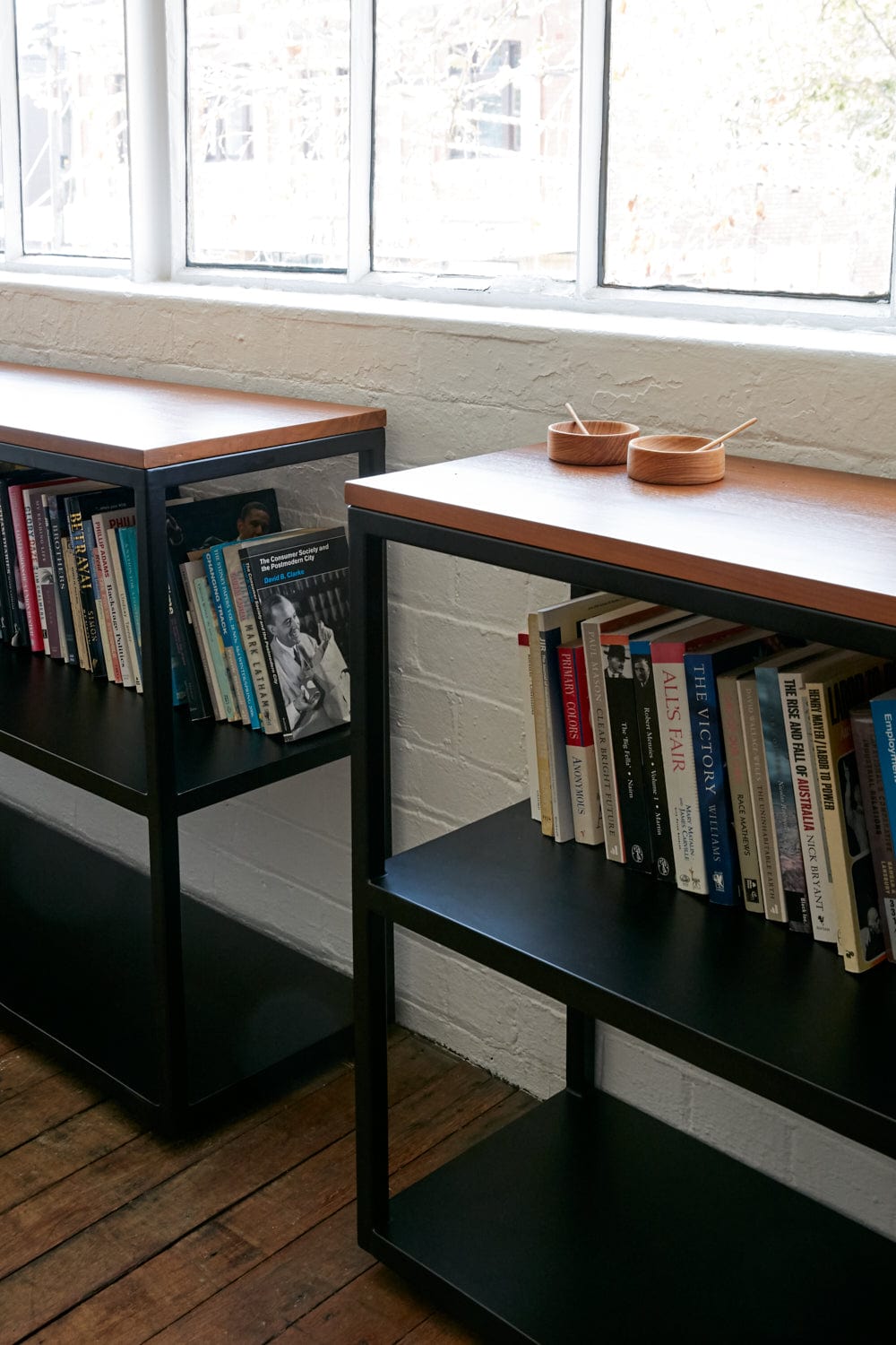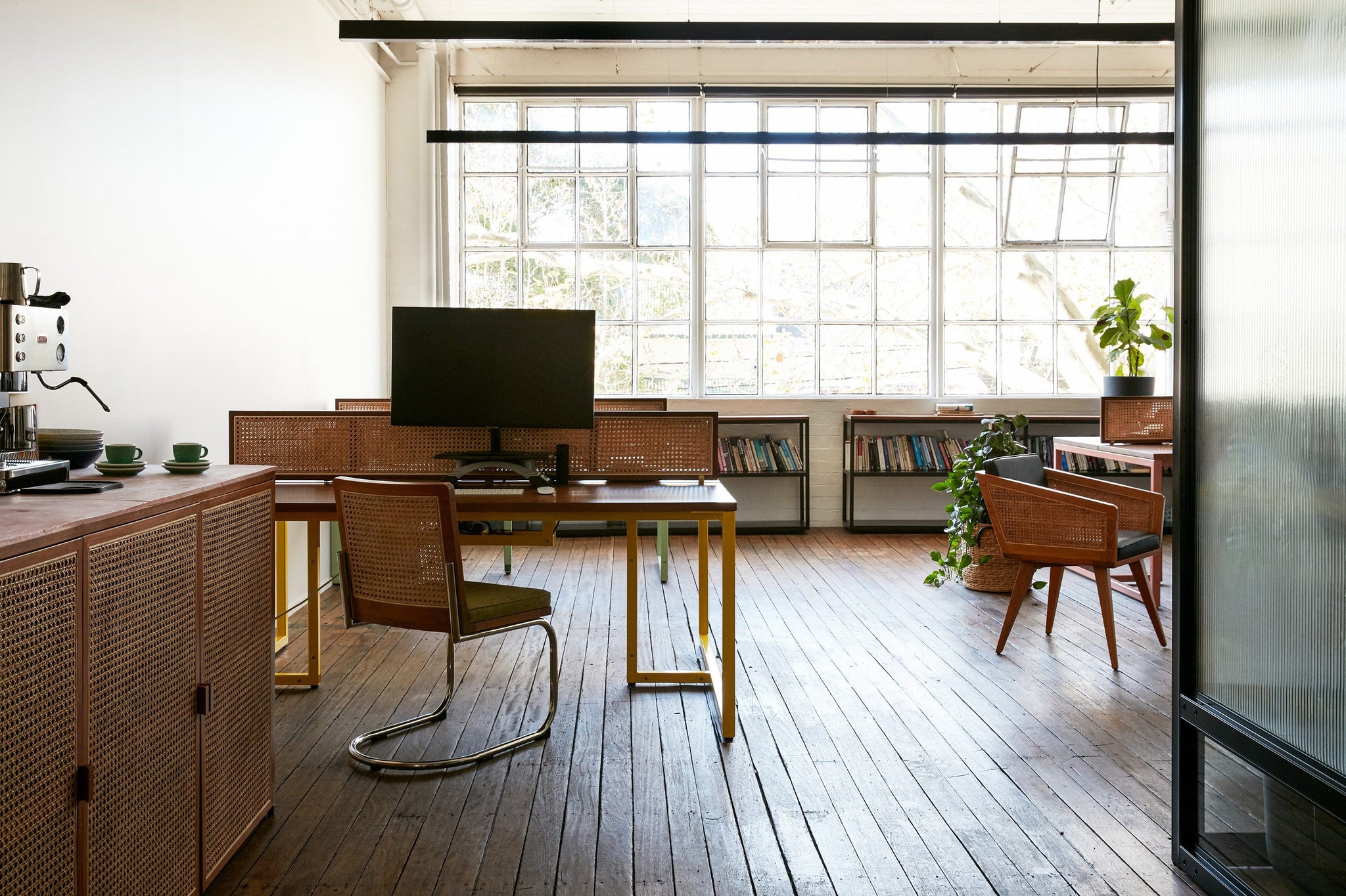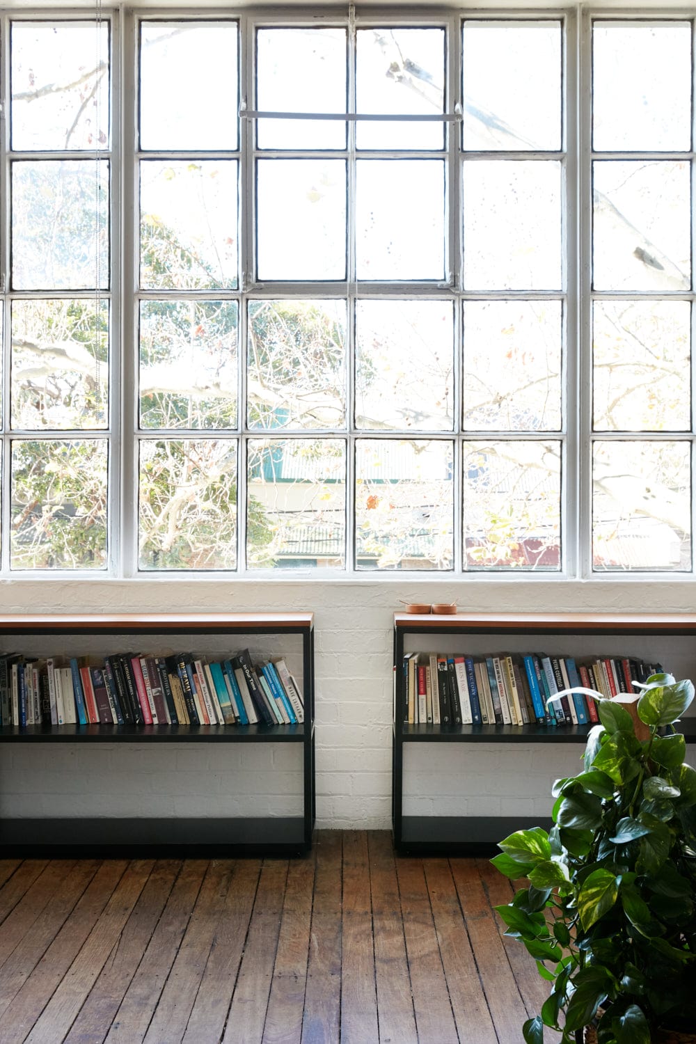 The prized feature of the space is the gorgeous square-paneled industrial windows that have a view of leafy Bourke Street. The Suzy shelves sit elegantly underneath and were made to measure to house their extensive collection of books and journals.