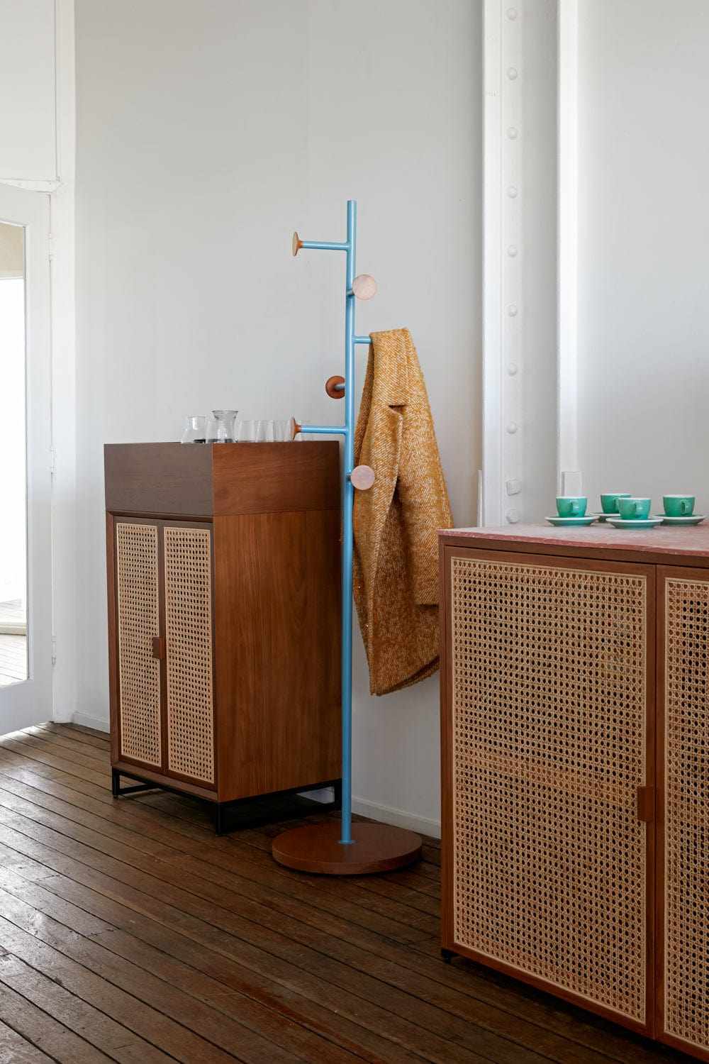 At the entrance, our NCW storage units in wood and rattan feature a single unit for glassware while the longer unit is used as a tea point tailor-made with an integrated fridge and pink recycled plastic top.