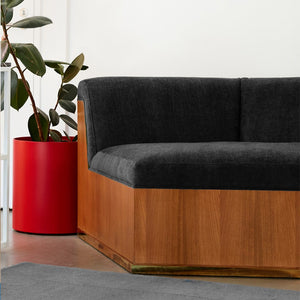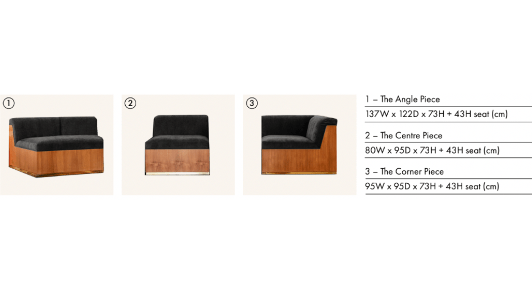 Designed with a wood veneer base detailed with solid brass and topped off with a plush fabric cushion available in 5 colours. The monolithic structures are each designed to sit independently or as a group. Both corner pieces can be left or right-hand facing and the middle piece can join any two pieces together - letting you create the perfect setting to suit you and your space.