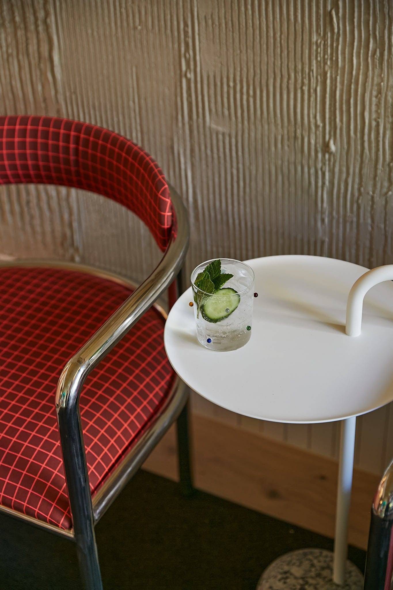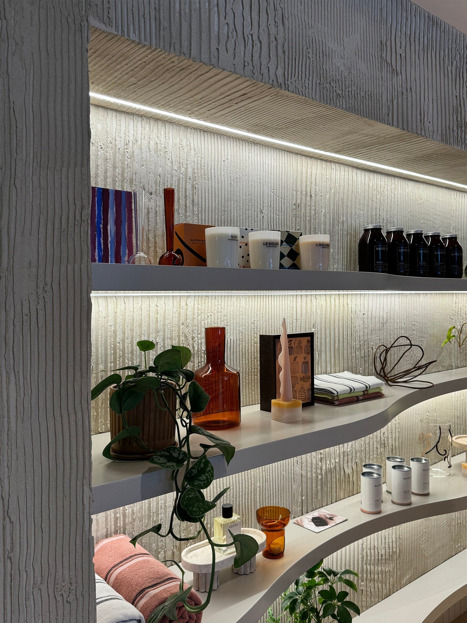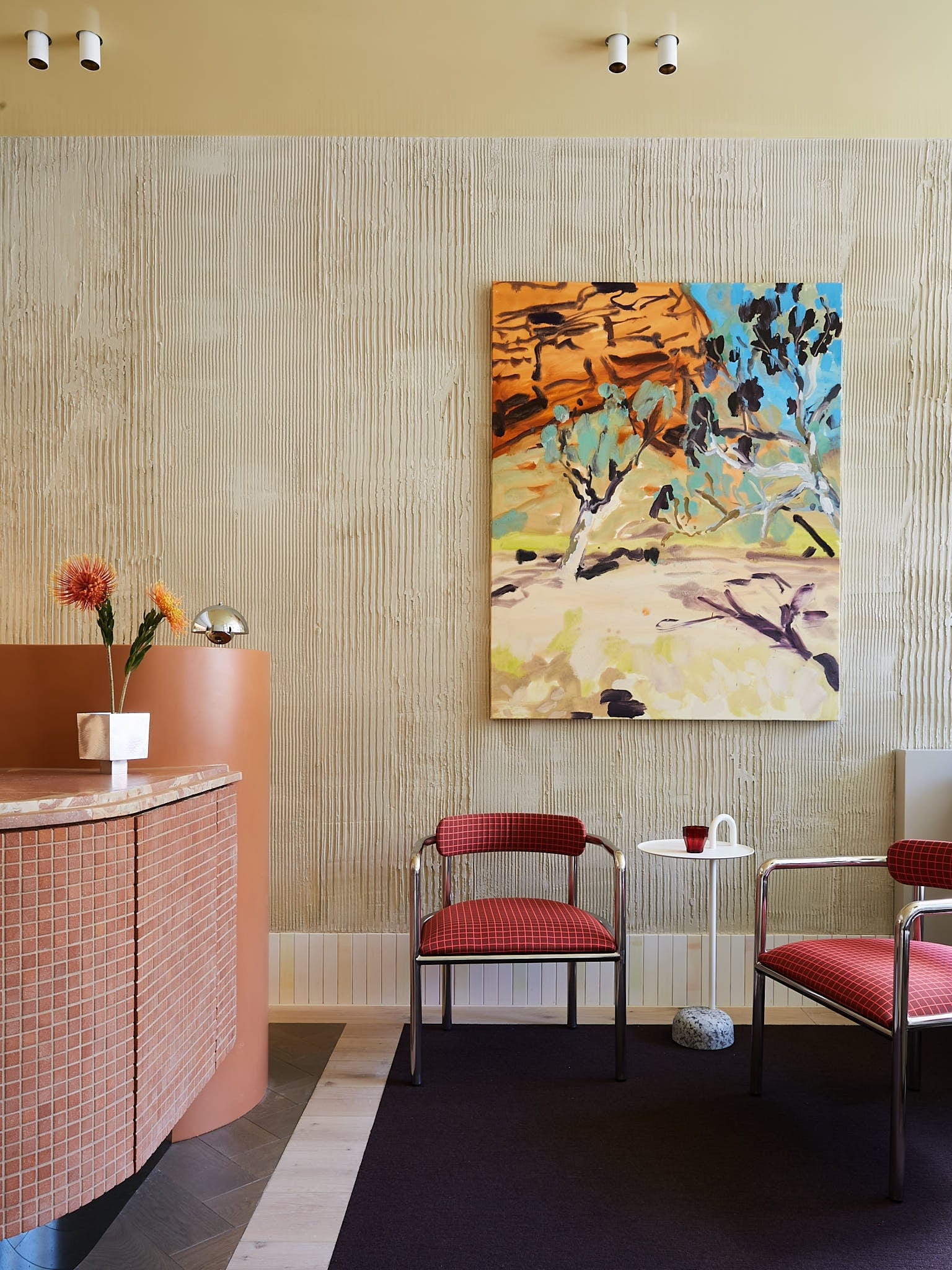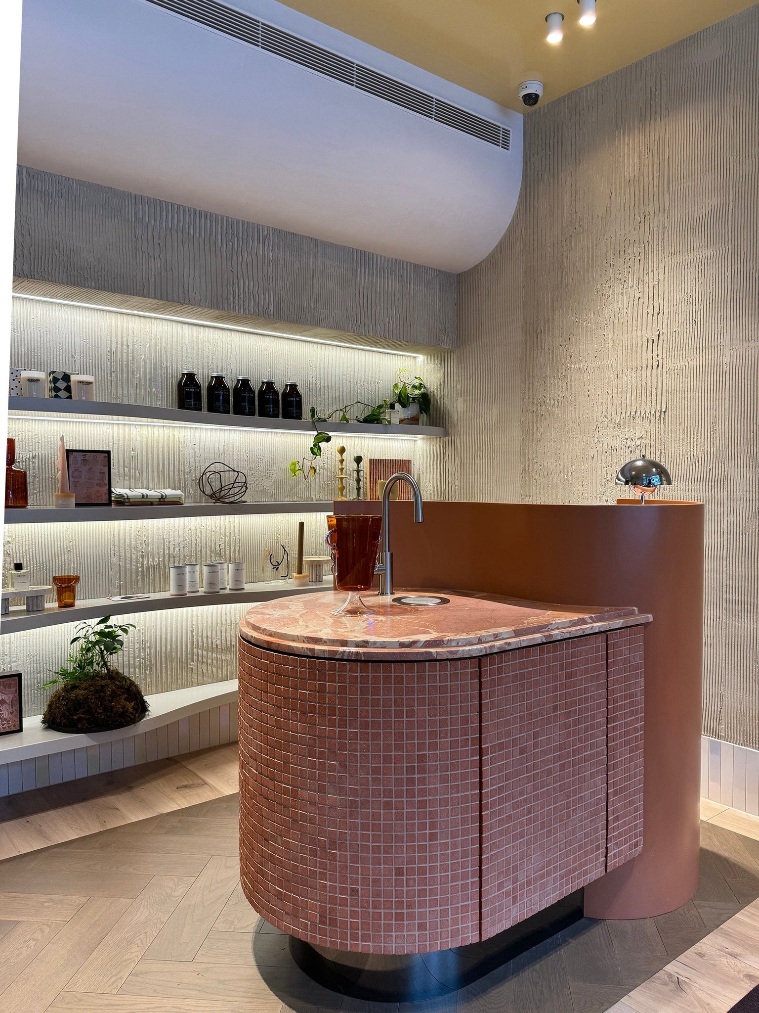 Our Cinta chairs sit proudly in the space in a custom Kvadrat fabric. Accessories related to your upcoming "ritual" are strategically placed and available for purchase from collaborations with local brands like Black Blaze and Maison Balzac.The reception is a community hub. Anyone client passing by can stop in for a glass of water or a chat, fostering a sense of belonging. He even wants to host community events in the space. The design ensures a unique view from every angle, each wall is something new you want to touch like the organic textured walls.