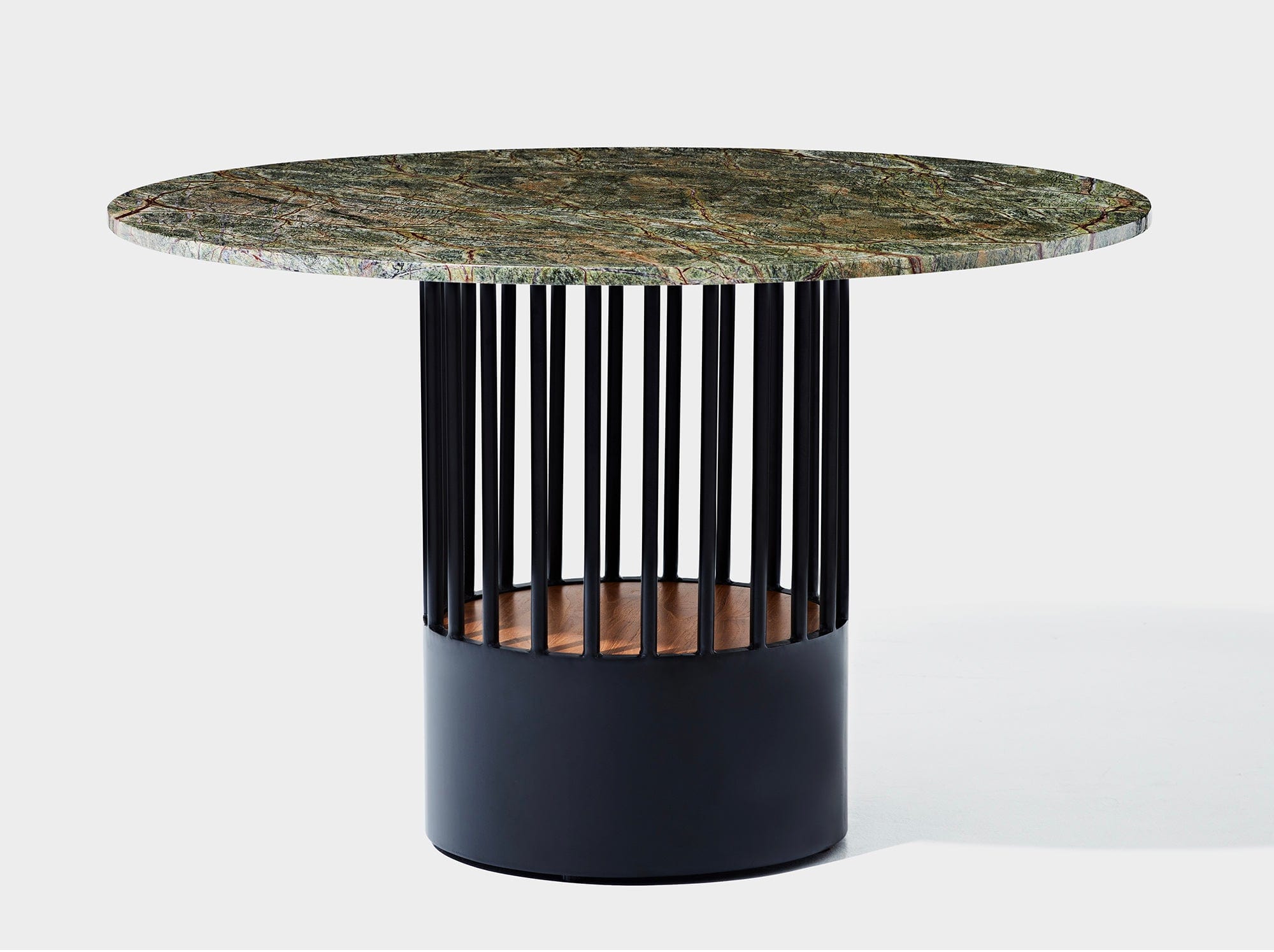 Willy over here is definitely going to be the topic of conversation over dinner. He's that mid-century style round dining table that those of you who appreciate a statement piece. The table features a gorgeous Indian Rainforest Green stone, brought to life with hues of green, brown, and orange, creating a striking colour way. His base features a strong yet elegant wire frame created by an architectural series of rods welded to a rounded plinth, wrapped around a circular solid teak wood piece.