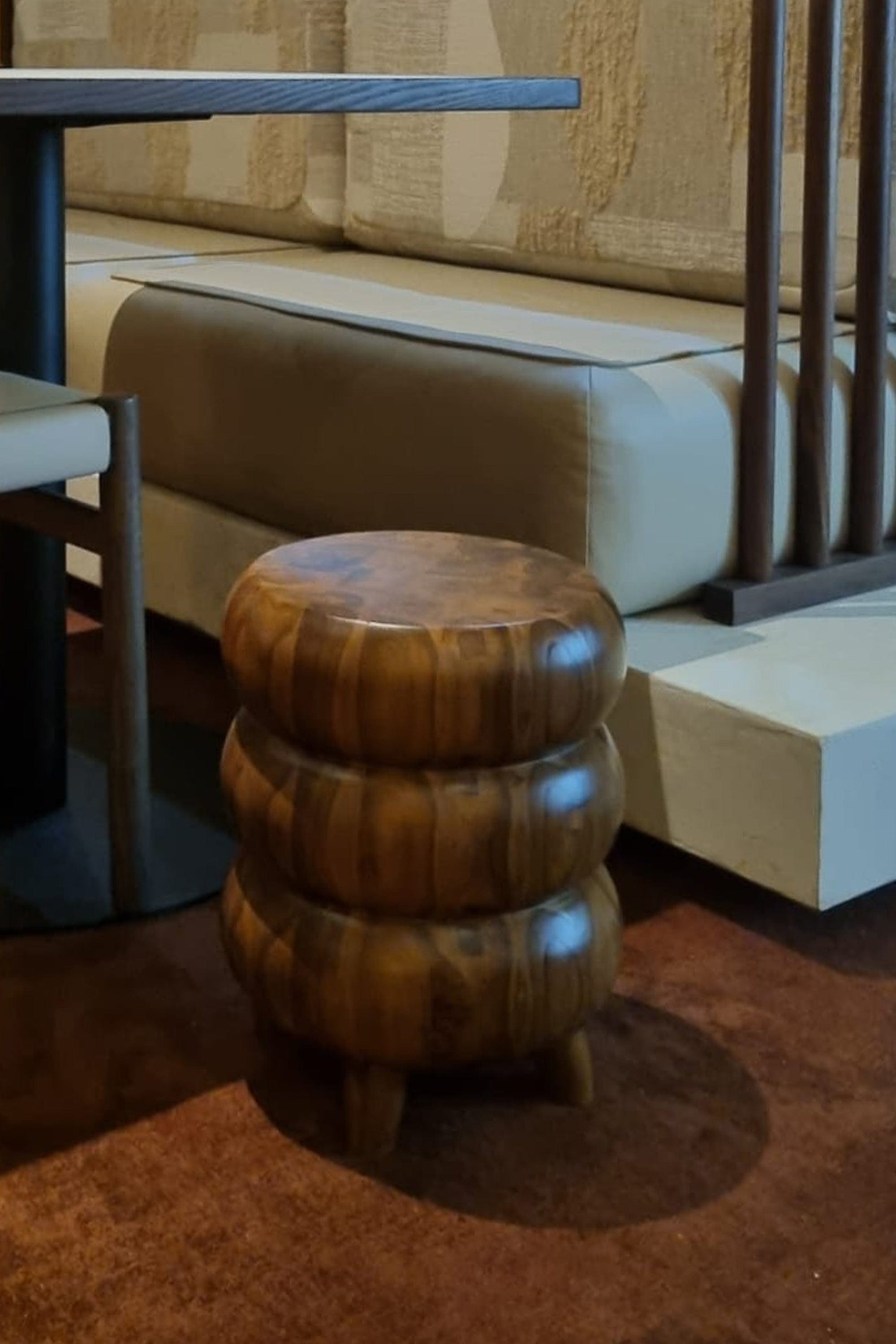 I'm Blob 1 – compact, curvy, and solid through and through. Hand-carved from a single block of reclaimed teak, I bring the kind of playful volume that makes you want to reach out and touch. I may look like a soft marshmallow, but I’m built to last – sturdy enough as a stool, charming enough as a side table. My surface may crack with age, but that's just me settling into my personality.