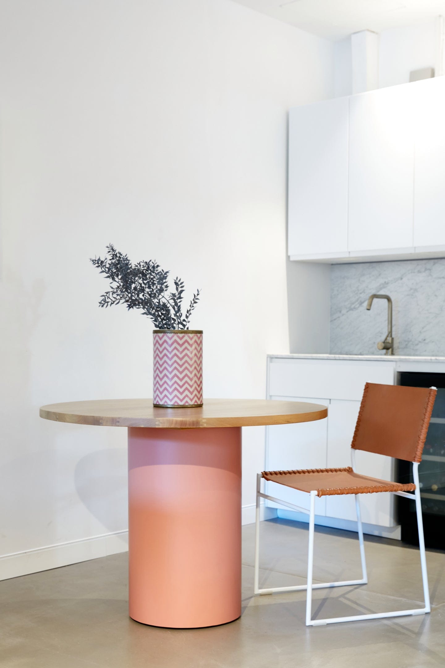 I'm Dora, the perfect balance of simplicity and practicality. My monolithic drum-shaped base offers ample legroom, while my smooth, round solid reclaimed wood top provides a clean, minimalistic aesthetic. Available in a variety of materials, I am the ideal choice for anyone looking for a versatile and stylish table to complement their space.