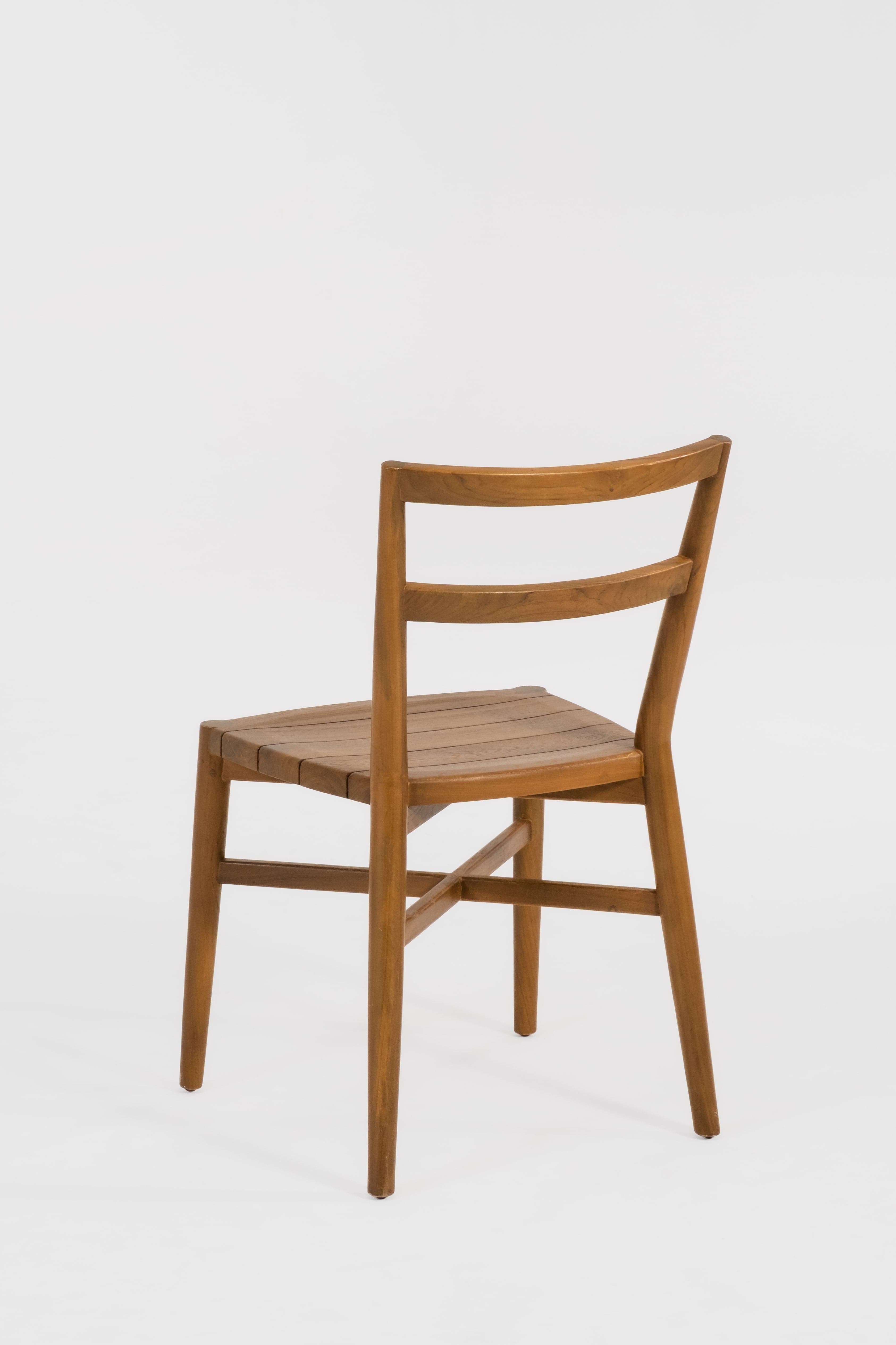 I’m Jepara, the outdoor dining chair built with both style and practicality in mind. Crafted from 100% reclaimed solid teak, I offer a slim, sturdy form that fits seamlessly into smaller outdoor spaces. My double-braced legs and slender back ensure stability and comfort, making me the perfect fit for your next outdoor dining setup.