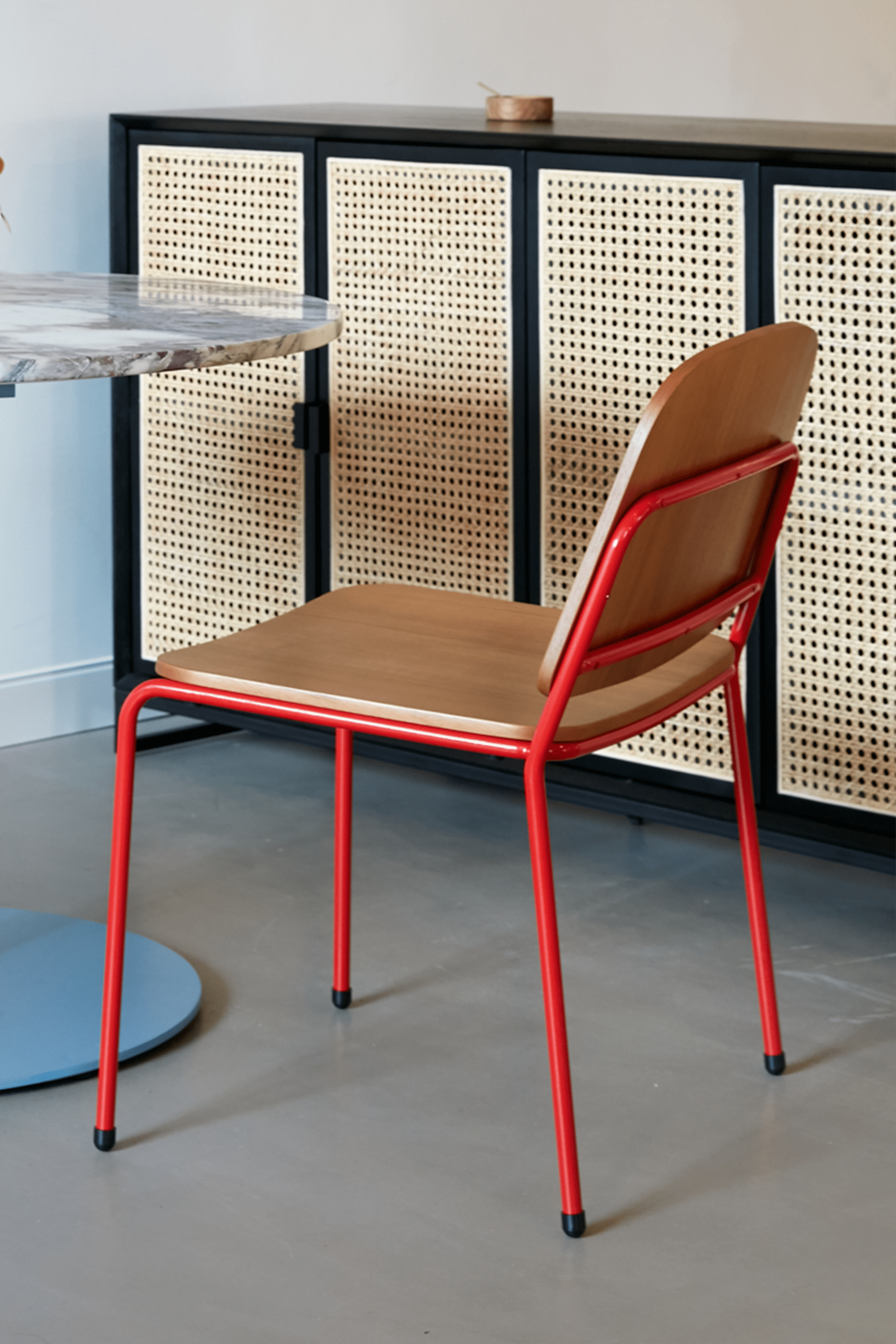 I’m Kami, your slimline and stackable dining chair. I’m curvy yet functional, and yes, I’m stackable! Available with a variety of plywood veneer seat options over a sturdy metal frame, I’m designed to complement multipurpose spaces