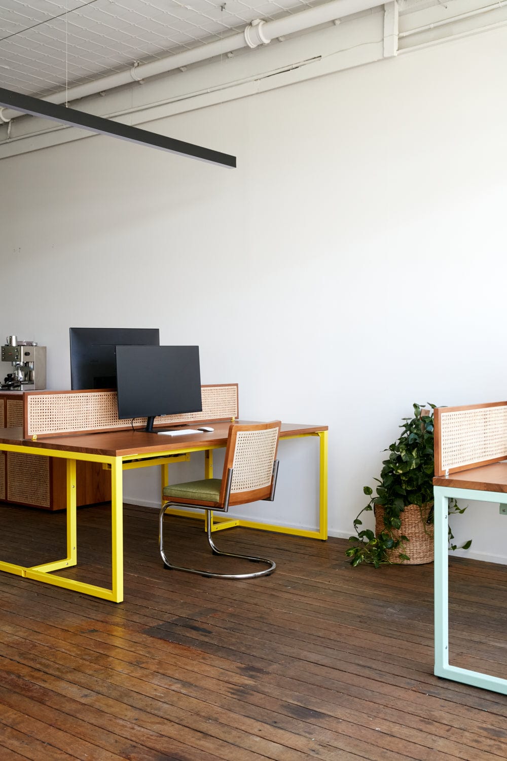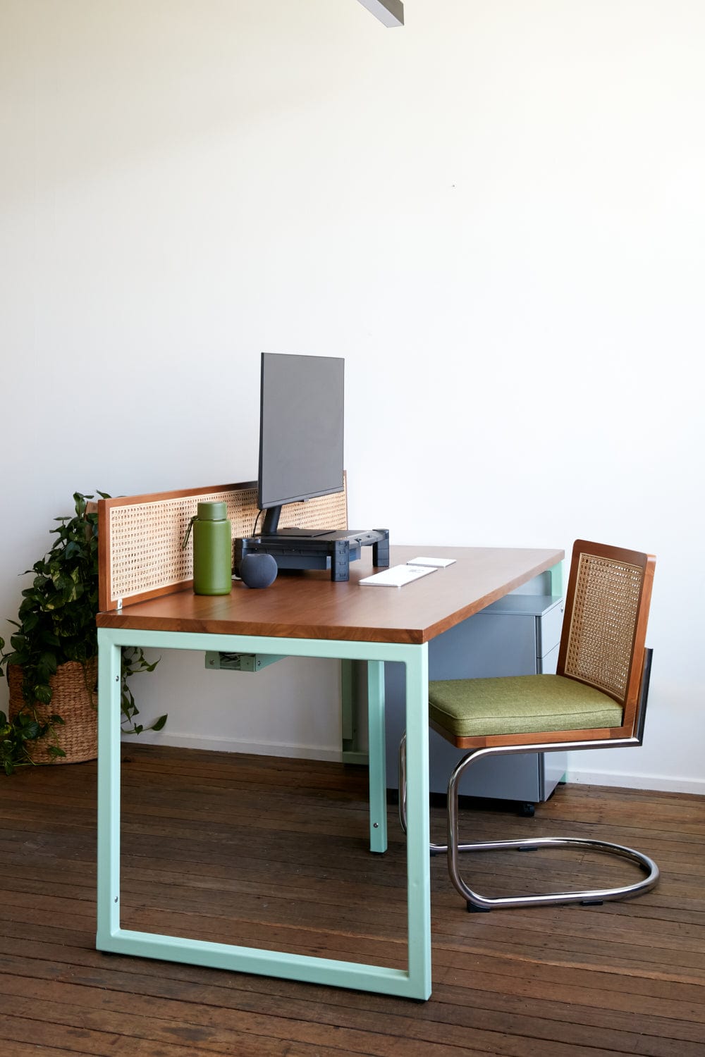 The "Non-Corporate Workstation" (NCW) is all about having a little fun at work. She features a veneer desktop with solid wood edges, a natural rattan screen, and your choice of a metal or wood base – both fitted with cable trays and leg holes to keep things tidy. The NCW is where serious work meets serious style... from where you'd rather work.
