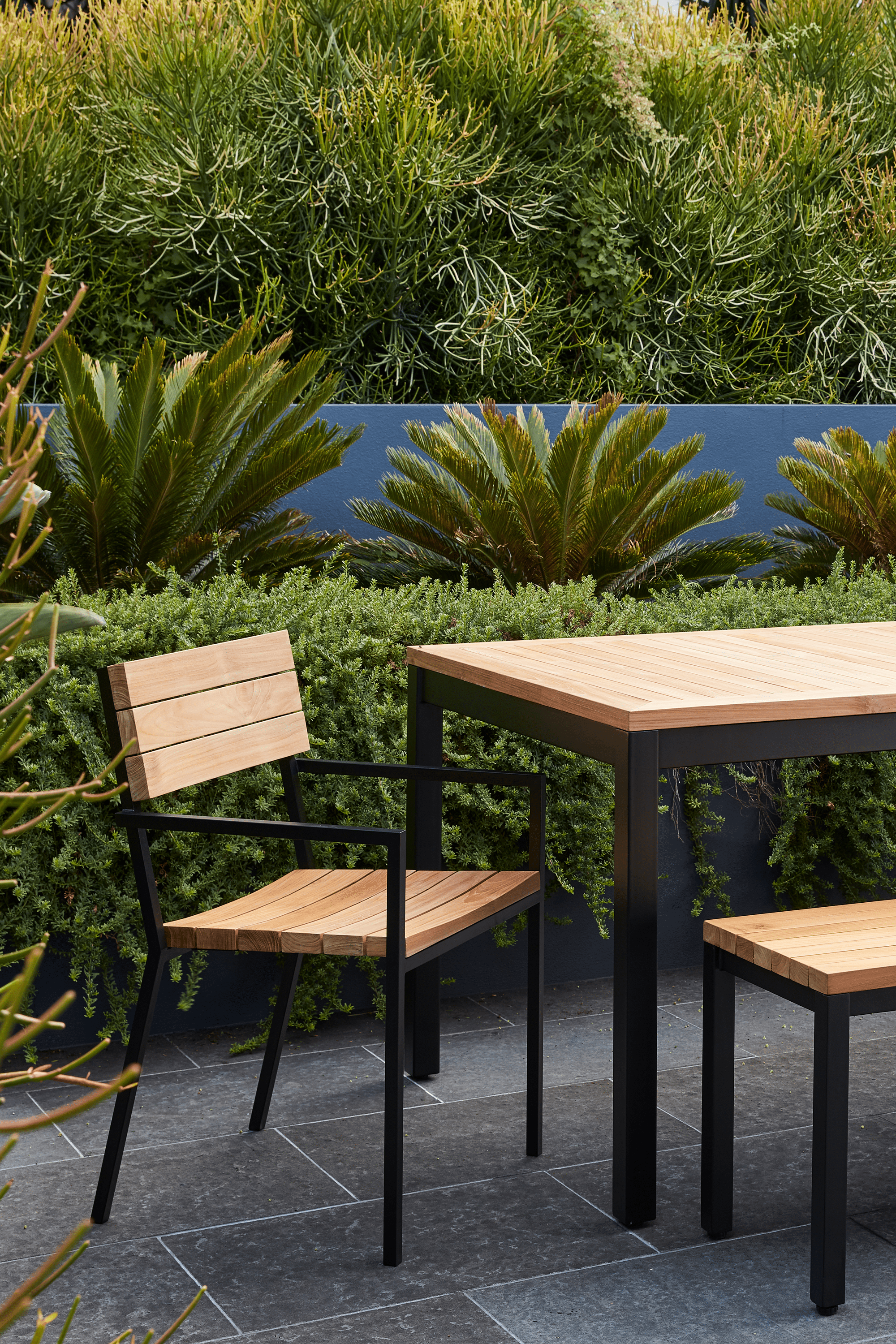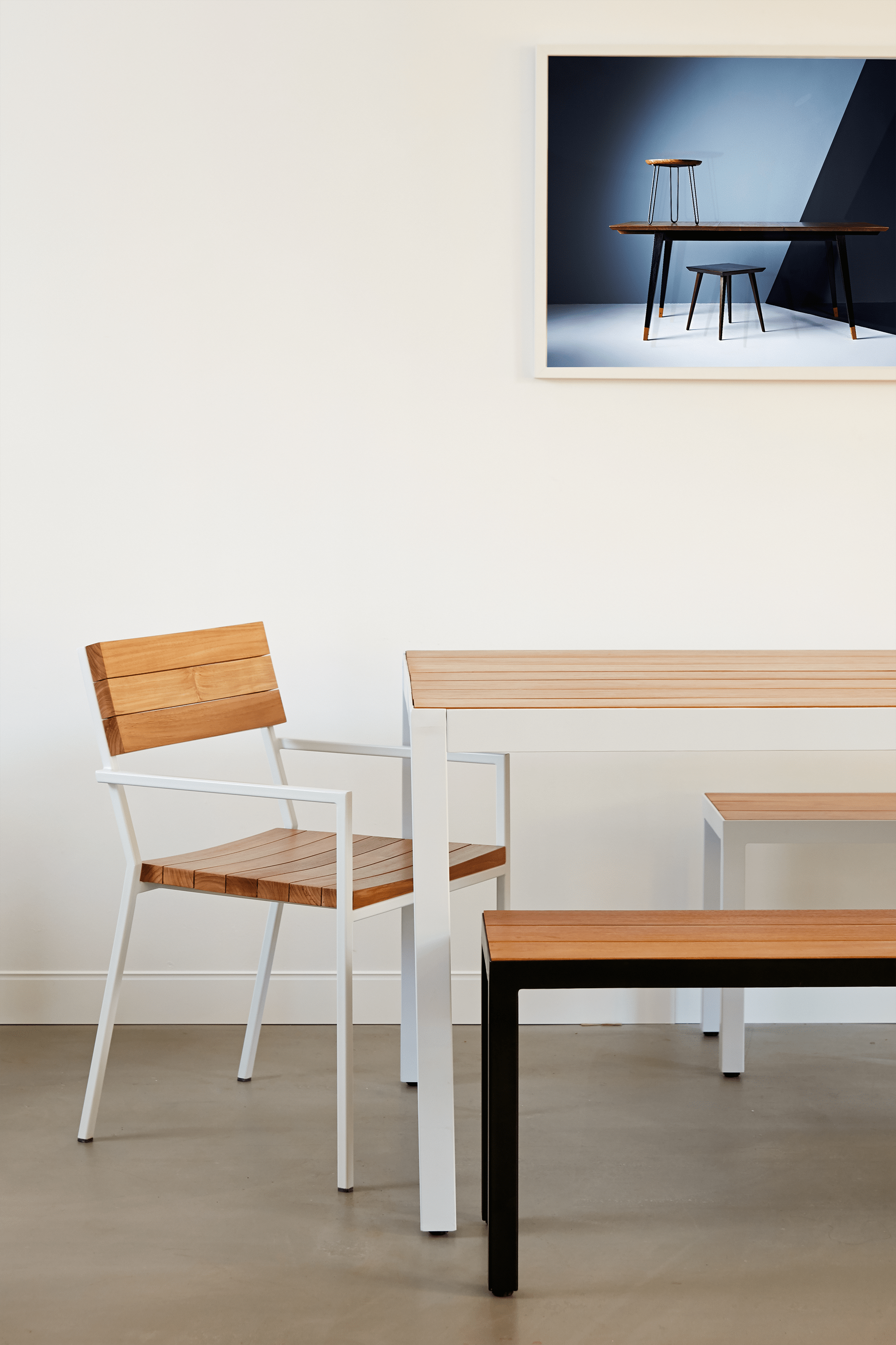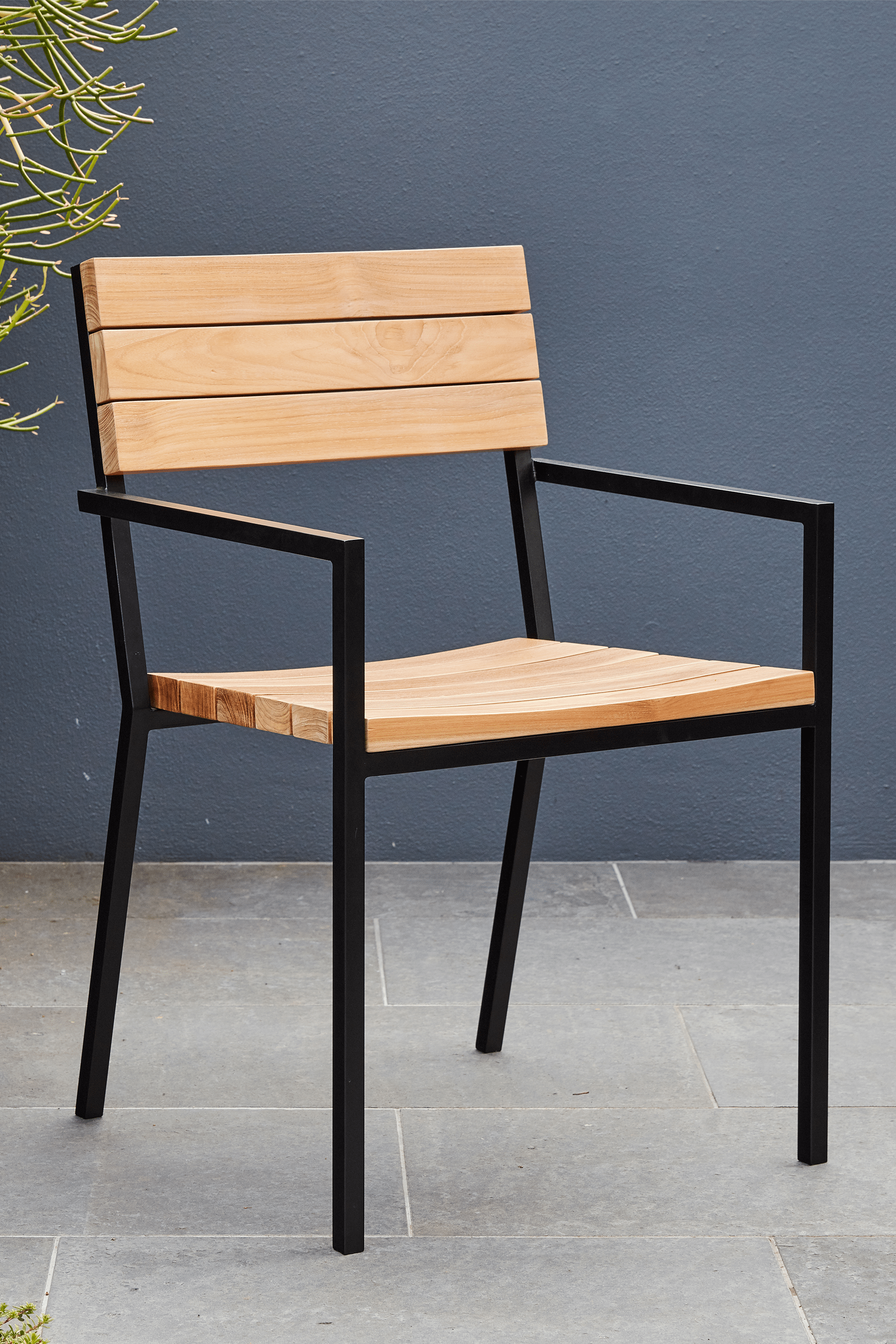 I'm Suzy, and I bring structure and comfortability to your outdoor space. My hand-carved slats of solid reclaimed teak wood rest on a powder-coated stainless steel frame with armrest, designed to stack four high. Elegance, functionality, and simplicity—no compromises here.