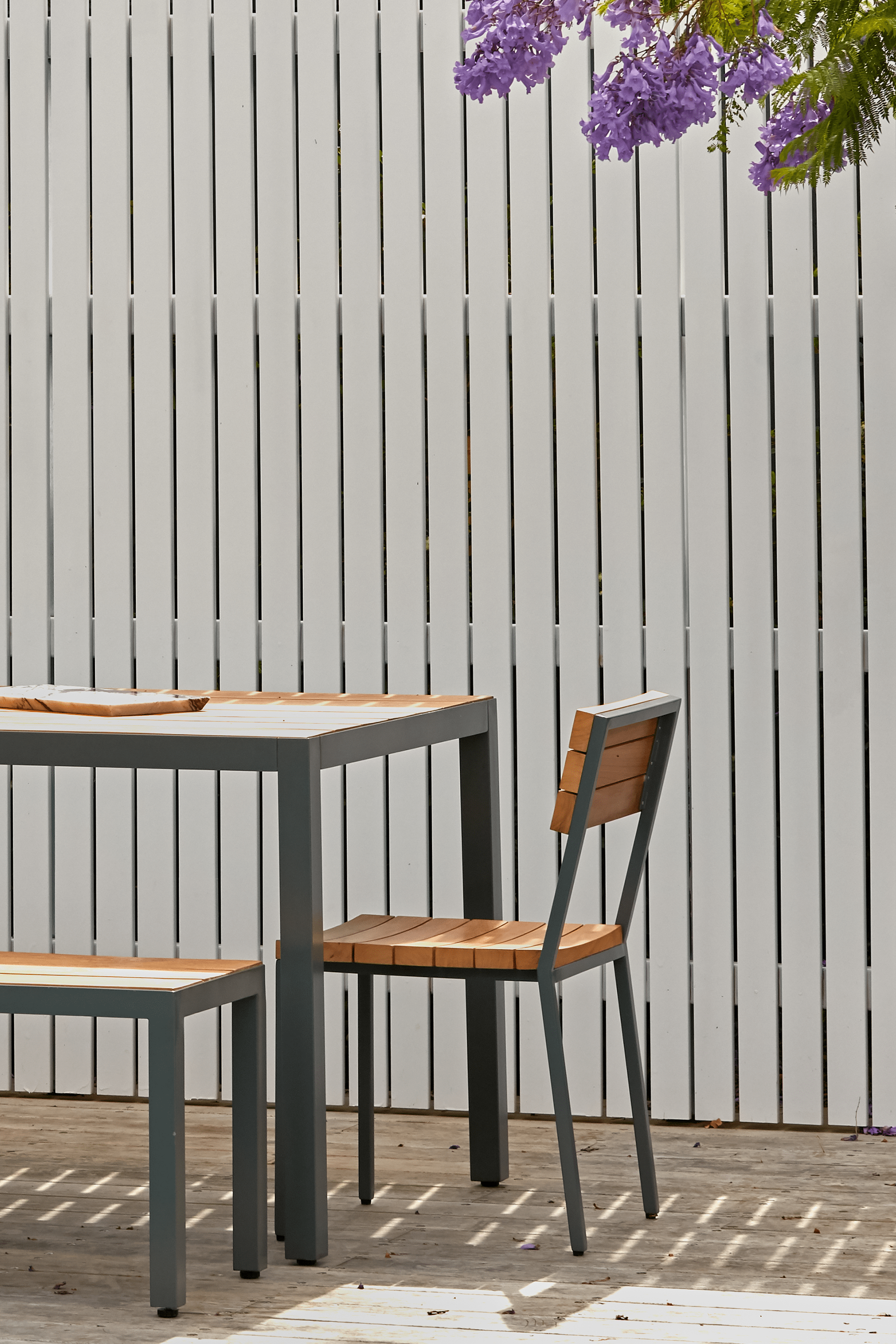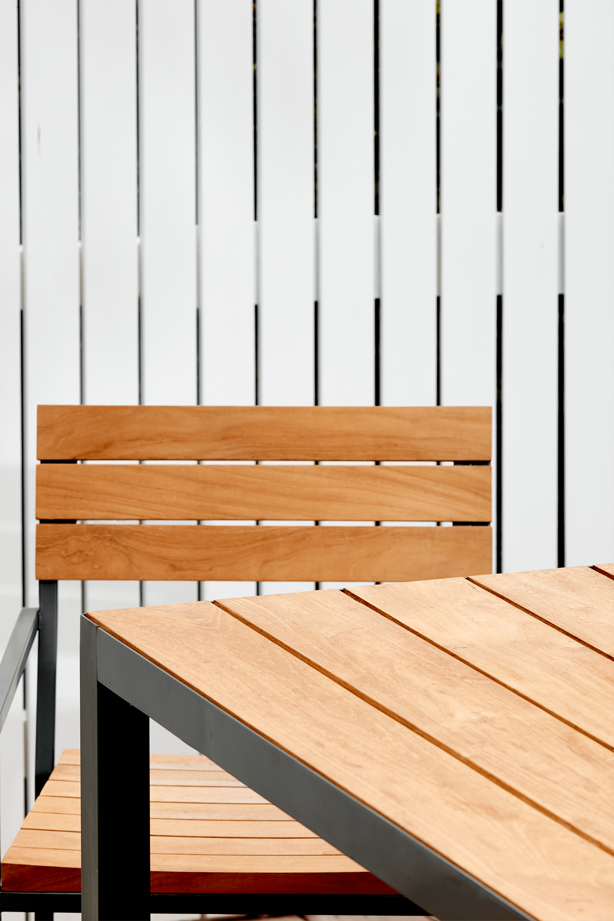 I'm Suzy, and I combine structure with stackability. Slatted solid reclaimed teak wood pairs with a powder-coated stainless steel frame, built to stack up to four high. Elegant, functional, and unapologetically simple, I'm here to elevate your outdoor dining experience.