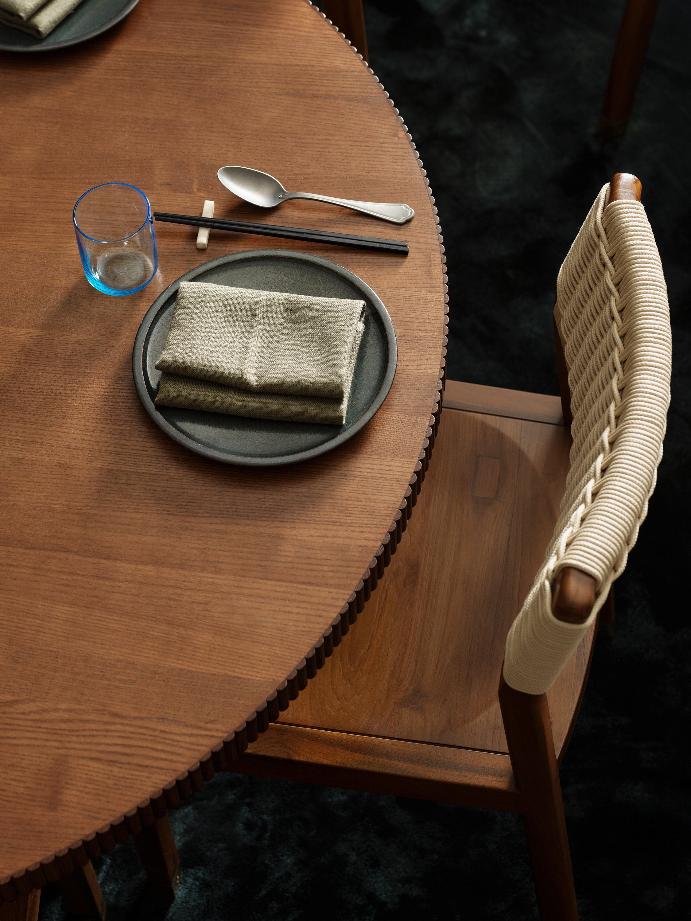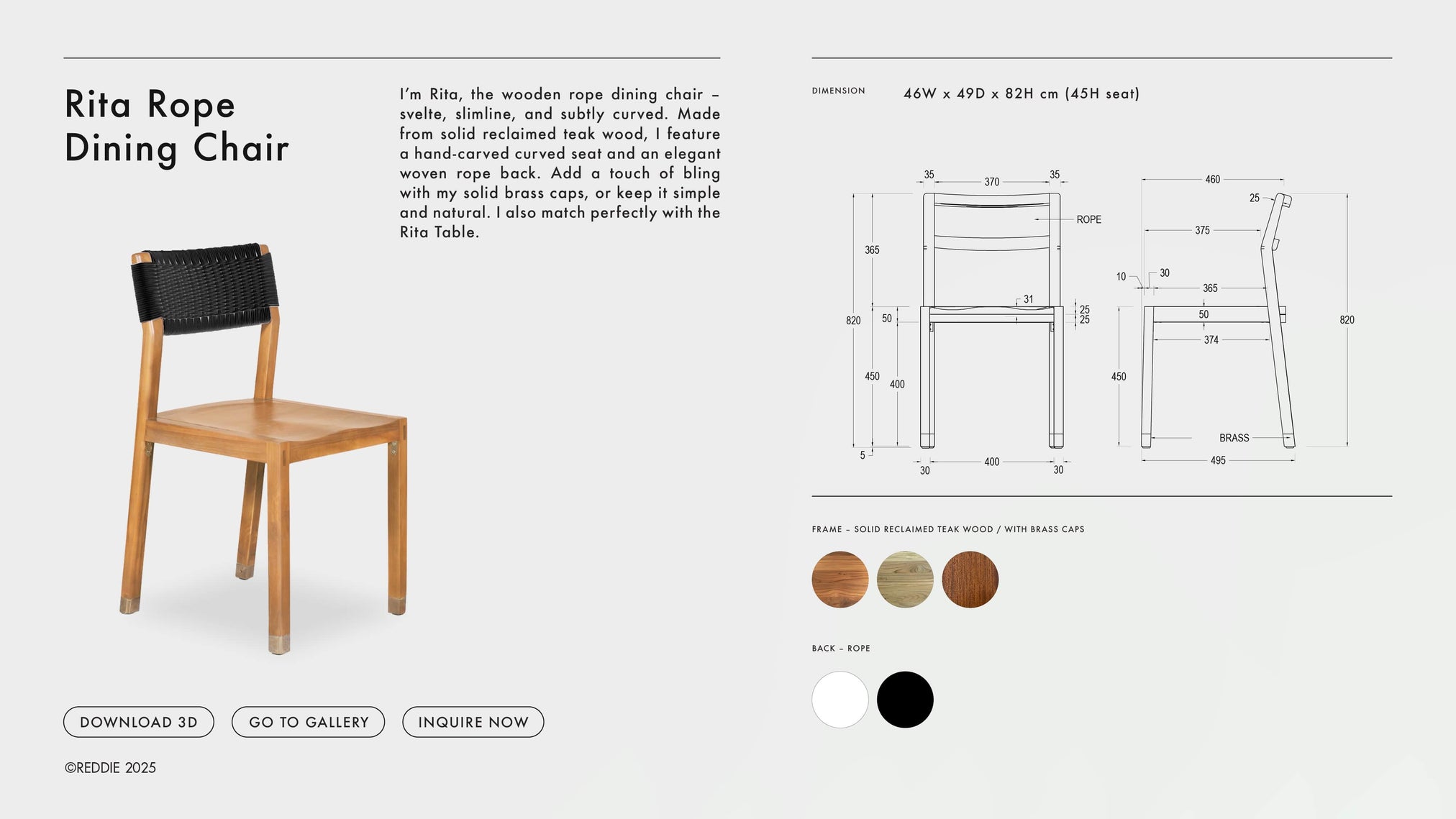 I’m Rita, the wooden rope dining chair – svelte, slimline, and subtly curved. Made from solid reclaimed teak wood, I feature a hand-carved curved seat and an elegant woven rope back. Add a touch of bling with my solid brass caps, or keep it simple and natural. I also match perfectly with the Rita Table
