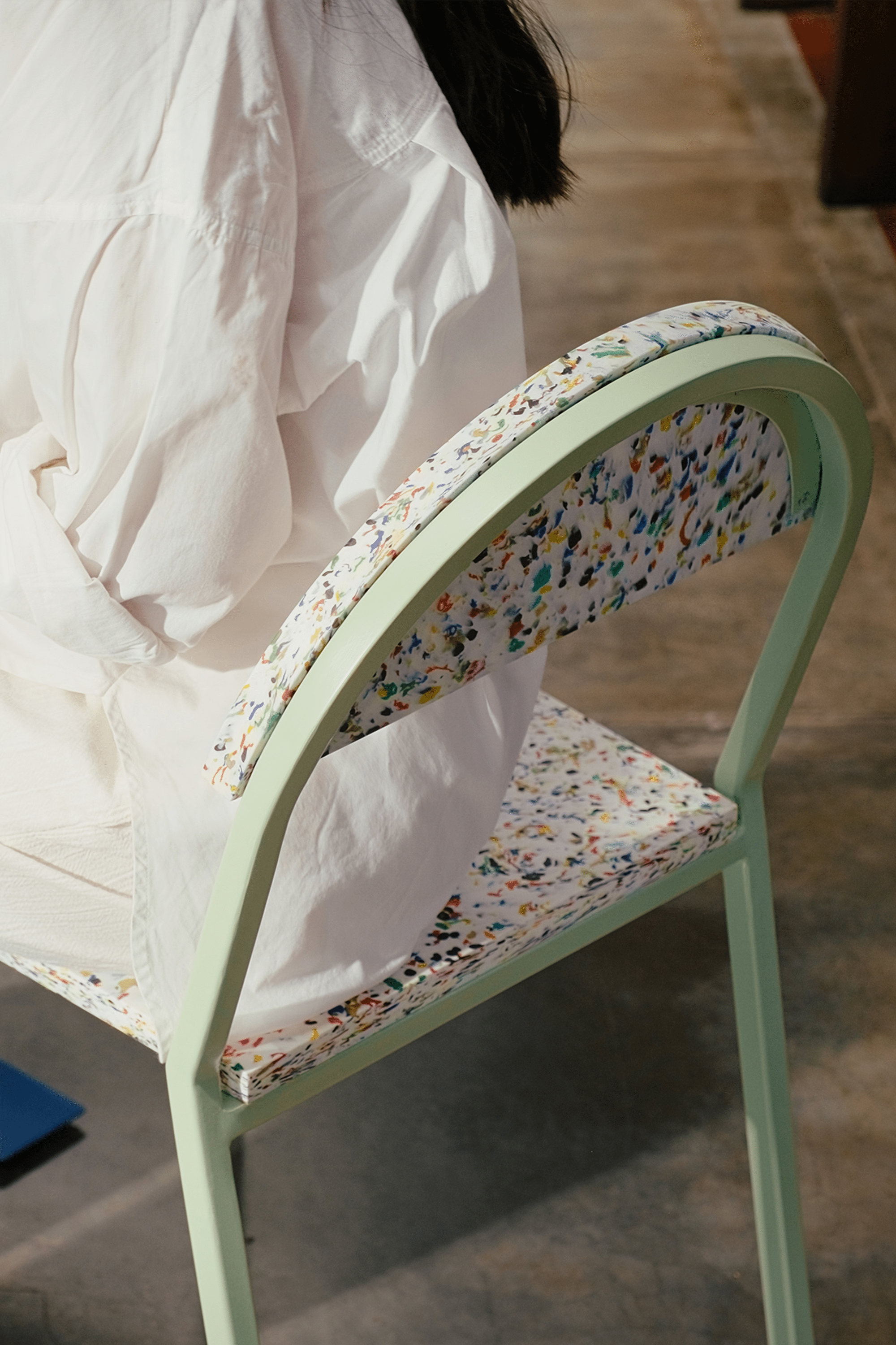 I'm Suzy, and I redefine structured stackability. Made from colorful recycled plastics, my frame is designed to stack up to four high. With a 100% recycled plastic seat and back (2500 bottle tops to be precise), I offer elegance, function, and sustainability all in one.