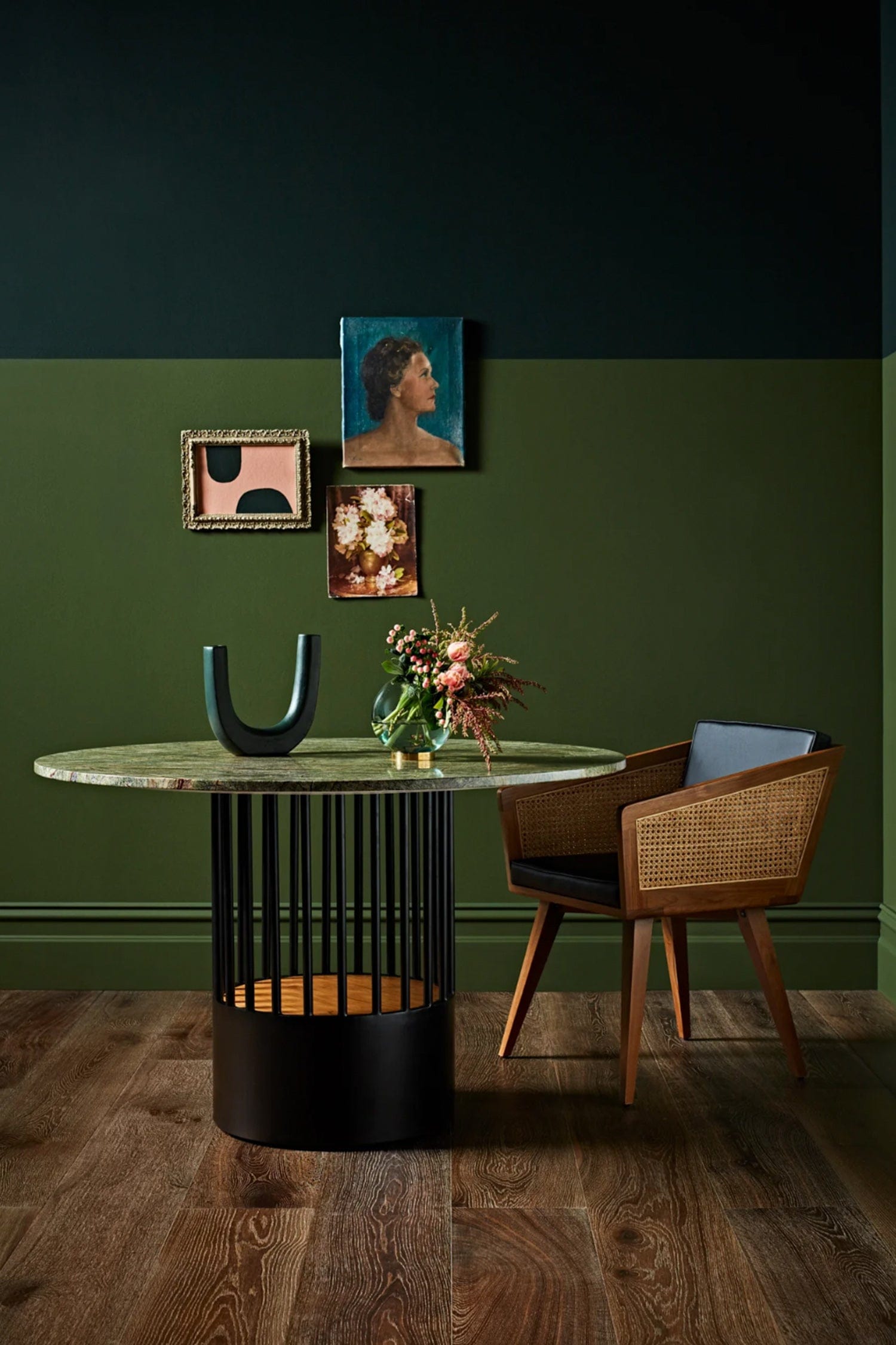 I’m Willy, a mid-century-inspired round dining table that’s sure to make a statement. My metal base, with rounded rods, is both sleek and sturdy. Hidden in my base is a round piece of solid teak wood, beautifully matching my top. Whether you opt for a bold forest green marble, an art-deco Carrara marble, or other options, I’m here to bring flair and character to your space.